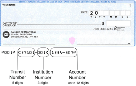 Click '+ Bank Account' in the top right corner of the 'Bank Accounts' page and then select ''Digital Cheque" on the modal. - Fill in the information on the form as provided on a void cheque/direct deposit form (see image below) provided by your bank and click 'Add Account'